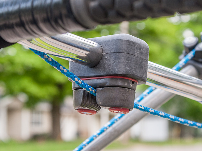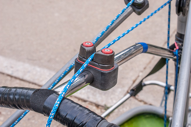 The sheet-angle looks OK for the normal mainsheet block location with the cleat mounted on top or beneath the steering tube.
