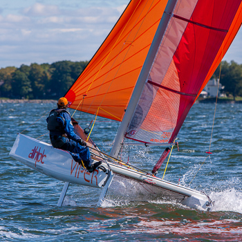 Fast catamaran racing on Lake Mendota.